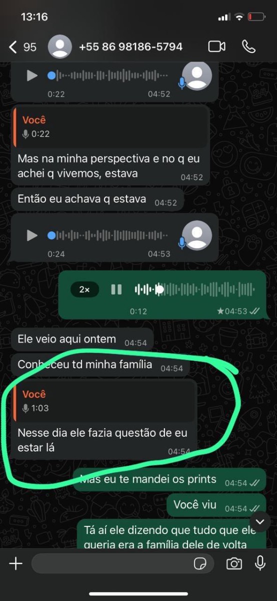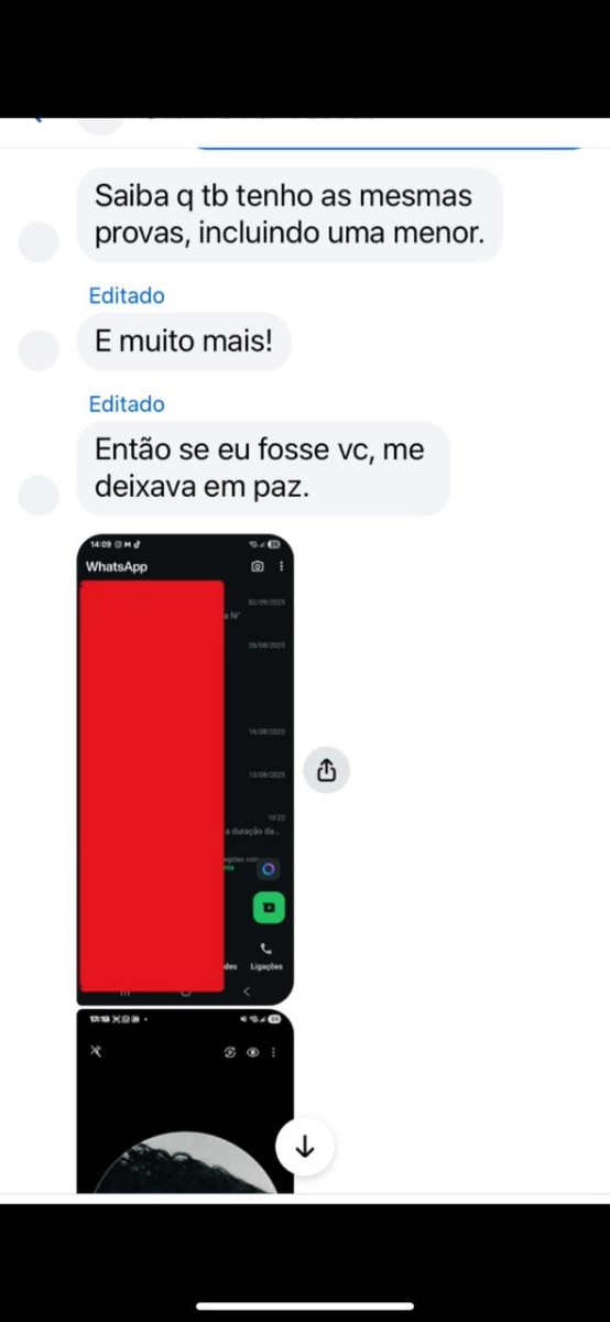 Depois de ter as provas, somadas à infantilidade, síndrome de Peter Pan, tentativa de me comprar com dinheiro que não era dela e também ameaças de que, se eu a deixasse, era para eu esquecer a criança que ela está esperando de mim, que eu nunca a veria (a criança), que nunca participaria de nada na vida dela – a mesma usou dessa chantagem, que também gravei. Tenho ao todo 12 áudios mostrando que tipo de pessoa ela é. Eu seria um mau-caráter se continuasse com a pessoa que colocou meu filho nessa palhaçada toda, que acarretou em um efeito dominó. Eu seria um mau-caráter se preferisse dinheiro a ficar com minha verdadeira família que foi tirada de mim e esclarecer tudo na justiça.