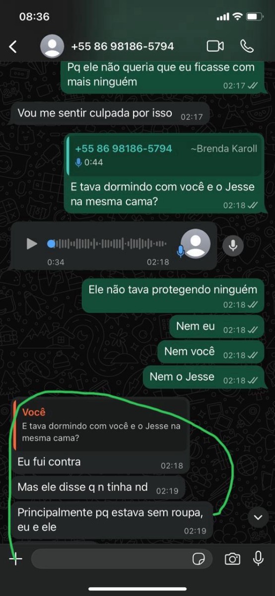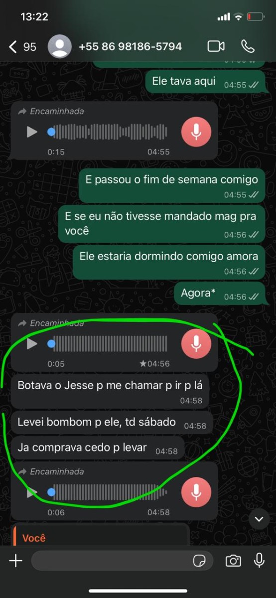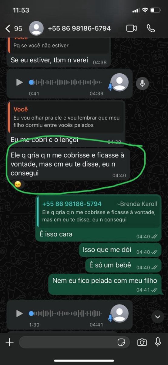 Nessas tentativas de Morgana entrar em contato comigo, acabei cedendo, e ela me permitiu ver o Jesse. No dia em que fui ver o Jesse e voltei para o apartamento, Brenda afirmou que sentiu que eu não voltaria mais. Comecei a desconfiar. Então, Morgana decidiu me mostrar o áudio em que Brenda afirmava tudo: que transamos no mesmo quarto que a criança etc. Nesse momento, já quis denunciar Brenda. Mas como provar que ela agiu de má-fé? Então, fiquei de sangue frio, fingi que não tinha conhecimento dos prints e áudios das alegações dela – agora eu entendia de fato o surto que Morgana teve; eu teria feito coisa pior. Decidi gravar Brenda reagindo ao próprio áudio em que ela contava há Morgana, mãe do no meu bebê o que acontecia quando estávamos Brenda, eu e Jesse. O áudio pivô de toda essa palhaçada com meu filho. Gravei ela reagindo; segue o áudio abaixo, tirem suas conclusões: