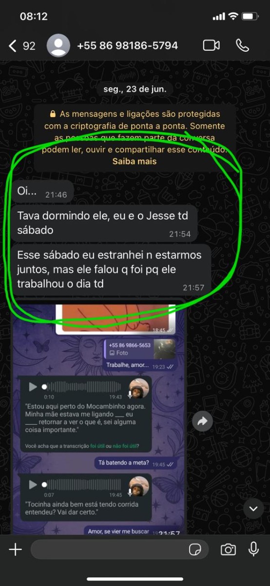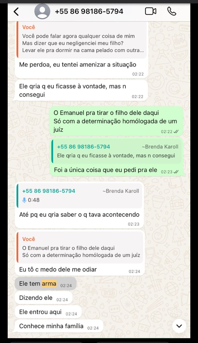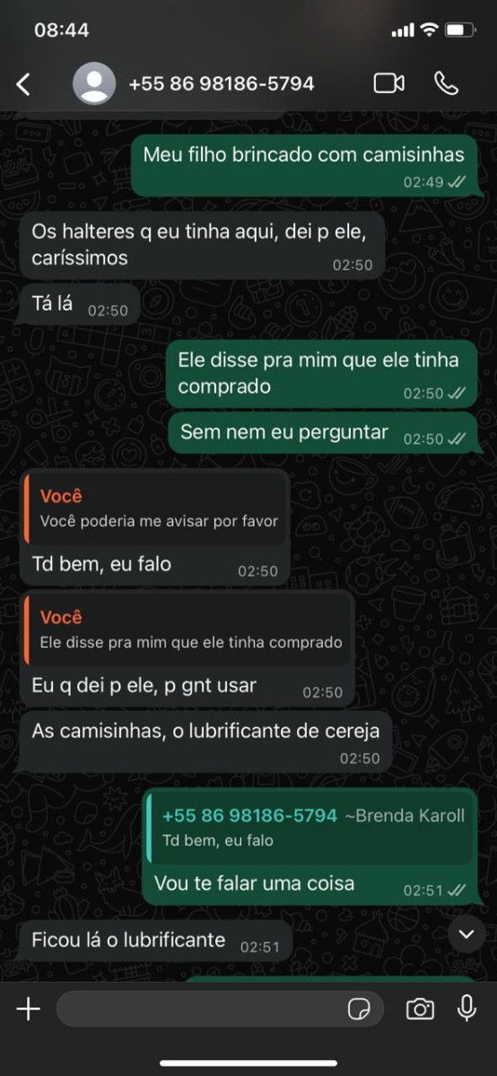 Depois de muita exposição na internet – pois Teresina tem muita gente desocupada que gosta de tambor batendo para poder dançar –, comecei a questionar certas atitudes de pré-adolescente da Brenda. Ela não parava de pedir PIX para o pai, tinha crises de criança quando contrariada; presenciei dezenas de infantilidades de alguém que só depois entendi por que ninguém a assumia, por que queriam apenas usá-la. Nisso, Morgana começou a entrar em contato comigo. Eu evitava responder com medo de ser uma armadilha por causa da medida protetiva, mas percebia como Brenda ficava nervosa.