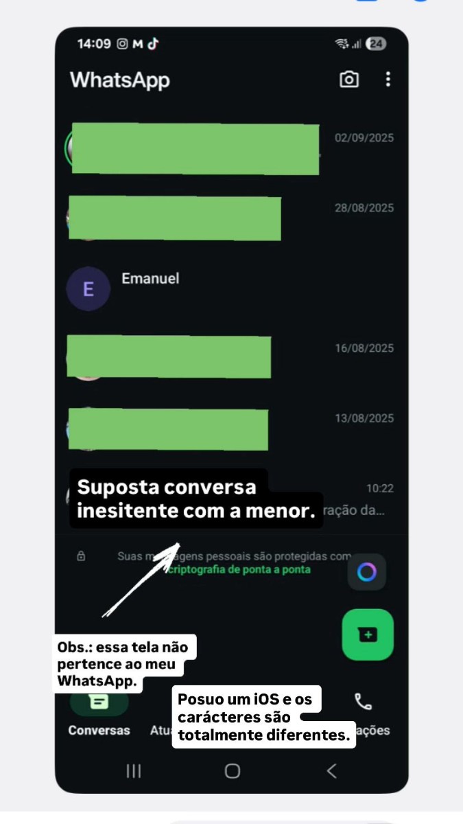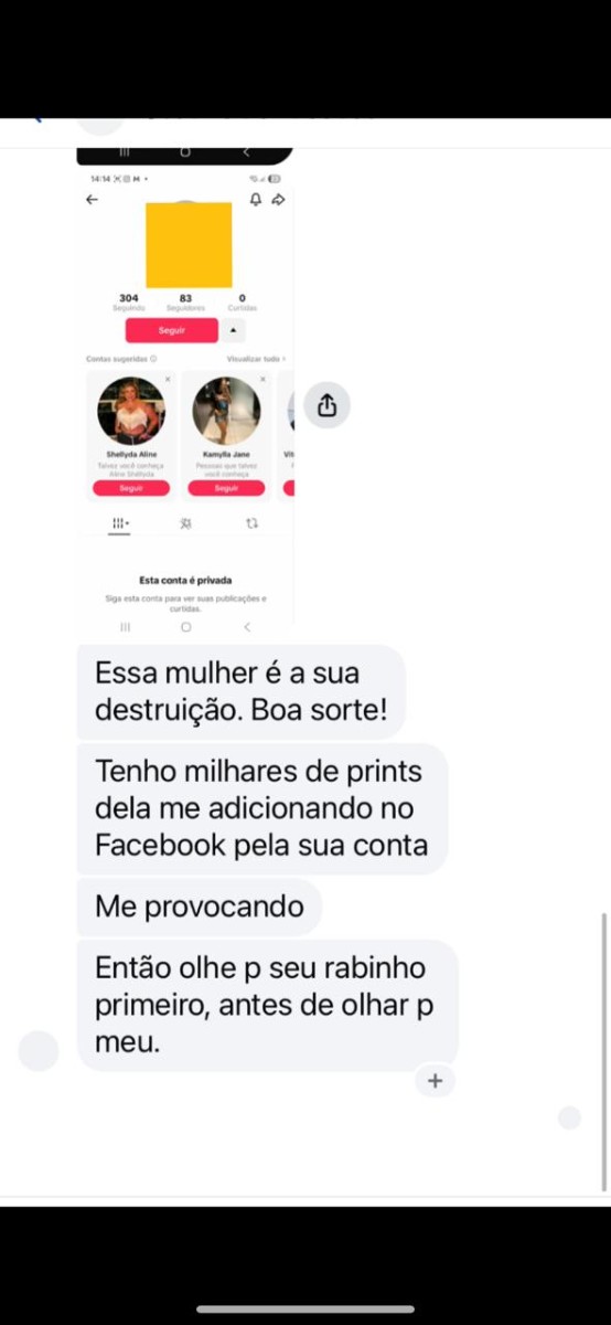 ''ESSE PEQUENO DOSSIÊ PARA ESCLARECIMENTO SE DEU AO FATO DE TER MEUS DADOS PESSOAS EXPOSTOS POR UMA PSI****TA SEM NOÇÃO QUE TAMBÉM EXPOS MENORES DE IDADE, E QUE A MESMA NÃO SE SAFARÁ FÁCIL DESSA. SEI DAS CONSEQUÊNCIAS QUE IREI ENFRENTAR POR ESTÁ FAZENDO ISSO. ESTOU ME REBAIXANDO AO REBANHO DE PORCOS, MAS SEI QUE ALGUMAS PESSOAS IRÃO ENTENDER. NA MINHA PELE, ALGUMAS PESSOAS IRIAM FAZER COISAS ATÉ PIORES, MAS MEU FOCO É MINHA FAMÍLIA, E TUDO QUE VIER EM FORMA DE ATAQUE A ELA SE VOLTARÁ 10X MAIS FORTE CONTRA ESSA MALDITA OU QUALQUER PESSOA QUE SEJA. ANTES DE POSTAR ESSE MATÉRIAL TENTEI DIPLOMATICAMENTE CONVERSAR COM O PAI DA DONDOCA AFIM DA GENTE DÁ FIM SOBRE ISSO TUDO, DELA APAGAR AS POSTAGENS DELA, PORÉM NÃO SURTIL EFEITO, LONGE DISSO, ELA FEZ ALGO PIOR COLOCANDO MAIS UM MENOR DE IDADE NA NARRATIVA DELA. ESSA ÚLTIMA DELA FOI O MESMO QUE SE TRANCAR EM UMA CELA E JOGAR AS CHAVES FORA.